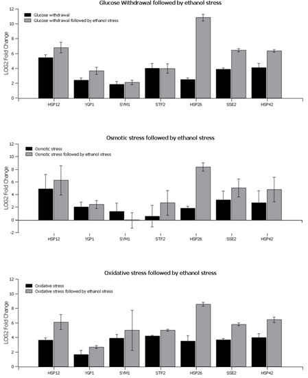 The expressions of seven genes (HSP12, YGP1, SYM1, STF2, HPS26, SSE2, and HSP42), which were shown to exhibit the behavior of interest in all sequential stresses, were measured using RT-qPCR to confirm the transcriptome results. The RT-qPCR results indicated that these genes were upregulated after glucose withdrawal followed by ethanol stress and oxidative stress followed by ethanol stress, as illustrated in Figure 4.