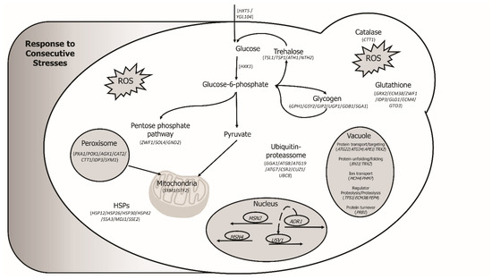 Schematic representation of the yeast response to sequential stresses. Upon sequential stresses, several genes (some of them represented within parenthesis) from different pathways and mechanisms were induced. The transcriptome analysis showed the induction of genes related to carbohydrate metabolism, trehalose syntheses, glycogen storage, and NADPH regeneration by the pentose phosphate pathway. Some organelles also played a role in the response, such as the peroxisome, mitochondria, and vacuole. Several genes that are associated with oxidative stress response and with chaperone functions were also upregulated. Gene motif analysis indicated several TFs coordinating the response, including Msn2 and Msn4, as well as ADRdr1 and Usv1.