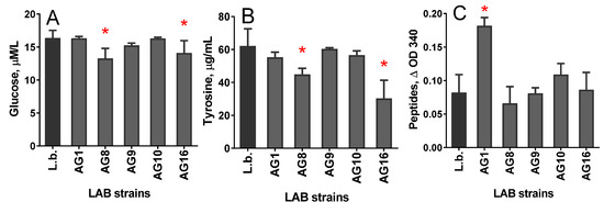 Chemical composition of protein-free extract of skim milk fermented by different strains of LAB (A) concentration of dextrose, (B) phenolic compounds (by tyrosine), (C) free peptides, reaction with OPA-reagent). L. b.—L. bulgaricus, AG1—L. plantarum AG1, AG8—L. fermentum AG8, AG9—L. plantarum AG9, AG10—L. plantarum AG10, AG16—L. rhamnosus AG16. Asterisks indicate statistically significant differences with L. bulgaricus according to non-parametric one-way analysis of variance (Kruskal–Wallis) test, p < 0.05.