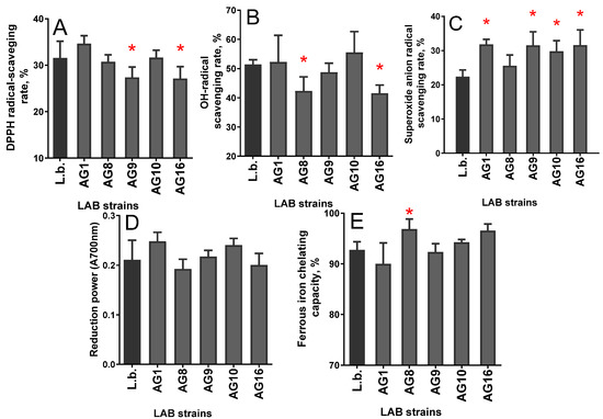 Antioxidant and chelating properties of a protein-free extract (pre-neutralized to pH = 7) isolated from skim milk fermented with different strains of LAB (L. b.—L. bulgaricus, AG1—L. plantarum AG1, AG8—L. fermentum AG8, AG9—L. plantarum AG9, AG10—L. plantarum AG10, AG16—L. rhamnosus AG16). (A) DPPH scavenging activity; (B) OH scavenging activity; (C) O2−scavenging rate; (D) Ferric Reducing Antioxidant Power Assay (FRAP); (E) Fe-Chelating Activity. Asterisks indicate statistically significant differences with L. bulgaricus according to non-parametric one-way analysis of variance (Kruskal–Wallis) test, p < 0.05.