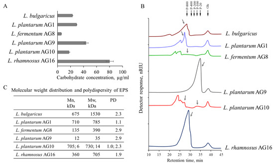 Next, the lyophilized EPS produced with various strains were analyzed. During the EPS separation by size-exclusion chromatography, carbohydrates were detected only in peaks with molecular weights more than 10 kDa, which confirms the polymeric form of all EPS. The molecular weight distribution of polysaccharides produced by different strains differed (Figure 3B). The EPS produced by L. plantarum AG9 and L. rhamnosus AG16 were represented by one clearly defined peak with molecular weights of about 35 and 700 kDa, respectively. For the other samples, in addition to the peaks identified in the region of the good resolution of the calibration curve, a series of peaks with a high molecular weight of more than 1500 kDa were observed. The monosaccharide composition of these high-molecular-weight peaks was very close to the composition of lower-molecular-weight ones (data not shown), which shows that the high-molecular-weight peaks contain the aggregates of EPS molecules.