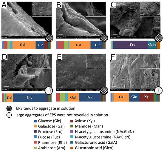 Differences in the composition and properties of lyophilized EPS reflected in the organization and morphology of the surfaces of the microstructures they form at dehydration have been analyzed with SEM. EPS produced by L. bulgaricus (Figure 4) has an uneven, fine spongy-like structure interspersed with voids with some layering in the spatial section, and the surface is relatively smooth. EPS of L. plantarum AG1 by hydrodynamic properties and composition is similar to EPS of L. bulgaricus, while it differs by the absence of xylose and an increased proportion of rhamnose and arabinose, and has a relatively smooth structure of densely packed threads tightly glued to each other. Additionally, there are areas with EPS fibrils of irregular shape not arranged into compartments. EPS produced by L. fermentum AG8, represented mainly by fructans containing galacturonic acid, are characterized by a tendency to aggregate in solution and form spongy-like structures appearing as a loose substance with relatively large pores. The EPS of L. plantarum AG9, the most enriched in glucose, form areas of both spongy-like and filamentous structures. The spongy-like areas are fine-grained but with large voids, and no layering could be detected. However, the presence of areas in the form of granularly packed strands is periodically observed, which then turn into fine-grained areas. Apparently, the stage of EPS formation when polysaccharide chains begin to form a polysaccharide network has been fixed during samples preparation. Moreover, this happens precisely during dehydration, since in solution this type of EPS does not show a tendency to form large aggregates (Figure 3B). The EPS of L. plantarum AG10, which, along with a high proportion of glucose and galactose, also contains rhamnose and arabinose, forms a microstructure like that of a fine-grained sponge; however, filamentous areas and layering could not be observed. The surface layer seems rough and inhomogeneous, partly similar to the structure formed by the EPS of L. bulgaricus; however, large voids are not visualized. EPS of L. rhamnosus AG16 are characterized by a high proportion of xylose in the composition and the absence of a tendency for the self-aggregation of molecules in solution. These EPS have a filamentous type of structure; the filaments are assembled into compartments of different thicknesses, which are eventually covered with a layer of an amorphous smooth substance. The pores in the EPS structures are very small, without significant voids.