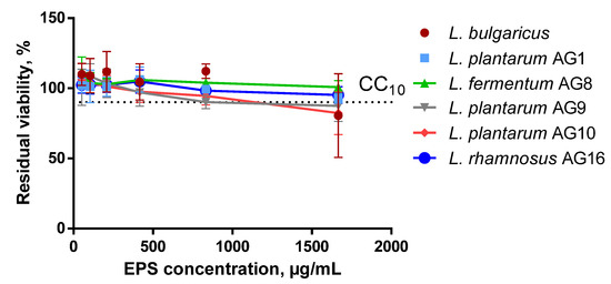 To exclude possible toxic effects, we checked the cytotoxicity of EPS (Figure 5). Only at a concentration of 800 µg/mL and more was a slight decrease in cell viability revealed in the MMT test with human fibroblasts. Only for L. plantarum AG1, L. plantarum AG9, and L. rhamnosus AG16 could the CC10 be calculated (934, 844, and 893 µg/mL, respectively). Thus, EPS of the studied strains, which are synthesized during the fermentation of skimmed milk, do not show toxicity to eukaryotic cells and are safe for food products.