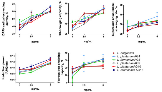 The ability to bind free radicals was high in the PFE of milk fermented by L. plantarum AG1, L. plantarum AG10, and L. bulgaricus (Figure 2A), and low in L. fermentum AG8, L. plantarum AG9, and L. rhamnosus AG16, which correlates with the level of free peptides. The PFE of milk fermented by the L. rhamnosus AG16 strain showed the lowest level of OH-binding activity, and the PFE of L. plantarum AG10 exhibited the highest one (Figure 2B). The PFE of milk fermented by the L. fermentum AG8 strain bound the superoxide radicals similarly to L. bulgaricus, while other strains led to higher activity (Figure 3C). The chelating activity of PFE was highest in the case of L. fermentum AG8 and L. rhamnosus AG16 strains, which showed the least ability to bind reactive oxygen species (Figure 2E). These data allow assuming that different molecular mechanisms are responsible for antioxidant and chelating abilities.