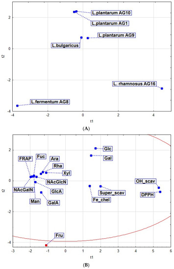Principal component analysis of antioxidant properties of LAB strains (A) and antioxidant properties of EPS (B).