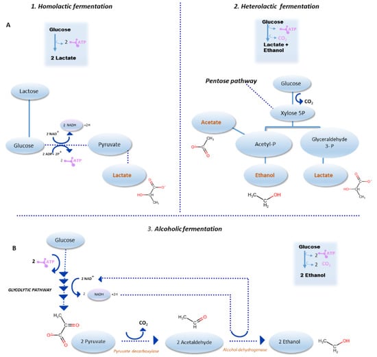 The glucose concentration increases during fermentation because other complex carbohydrates are metabolized by LAB and yeasts. The disaccharide lactose can be fermented by microbial enzymes liberating glucose and galactose after cleavage. Starting from glucose, homofermentative LAB produces lactic acid through glycolysis, while heterofermentative LAB generates, besides lactic acid, CO2, acetic acid, and/or ethanol [38]. Two major fermentation routes are found: lactic fermentation (LF) and alcoholic fermentation (AF). In lactic fermentation, the pyruvate molecules formed by glucose oxidation from the Embden–Meyerhof–Parnas or glycolytic pathway are reduced to lactic acid (homolactic fermentation). Streptococcus, Lactobacillus, and Enterococcus use this route (Figure 2A1). Another possibility is the pyruvate originating from a mixture of lactate, ethanol and/or acetic acid, through the oxidation of the coenzymes NADH + and H+ by the lactate dehydrogenase, and CO2 from a glucose molecule until ribulose 5 phosphate (heterolactic fermentation).