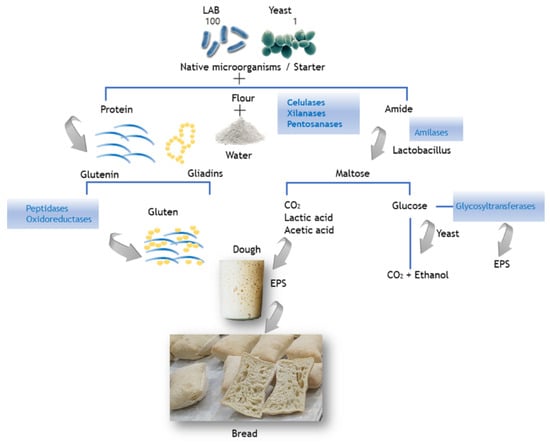Wheat flour is composed of starch (70–75%), water (14%), proteins (10–12%), non-starch polysaccharides (2–3%), lipids (2%), and soluble carbohydrates such as maltose, sucrose, and glucose (1.55–1.85%) The starch is degraded into glucose and maltose by flour amylase and glucoamylase by some sourdough LABs. Maltose is degraded into glucose by the enzyme maltose phosphorylase from LAB and by alpha-D-glucosidase, a maltase from Saccharomyces yeasts. In the dough, the available carbon source is thus maltose, followed by sucrose, glucose, and fructose, with some trisaccharides such as maltotriose and raffinose [37].