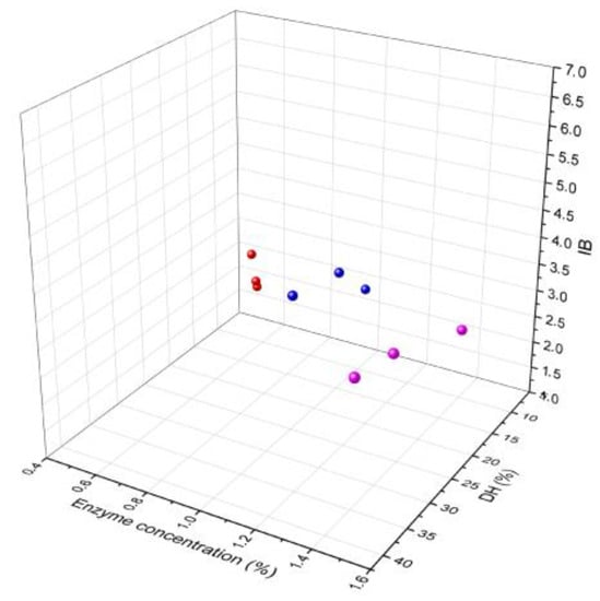 The influence of enzyme concentration on the IB and DH: red (0.5% enzyme concentration); blue (1% enzyme concentration); pink (1.5% enzyme concentration).