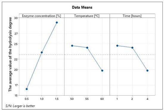 Considering the S/N ratio analysis on the DH presented in Figure 2, it is observed that this is directly proportional to the enzyme concentration and the duration of hydrolysis. In terms of temperature, in the range of 50–55 °C, the DH remains almost constant but decreases at temperatures higher than 55 °C.