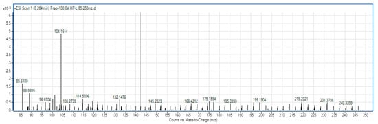 The activity of peptides is determined by the molecular weight, the number of amino acid residues, and their composition. Bioactive peptides are usually those that have short sequences of 2–20 amino acid residues and are inactive within the protein but can be released during digestion, processing foods, or through in vitro hydrolysis under the action of proteolytic enzymes []. The characteristic peak in the 85–250 m/z range can be seen at 219 m/z, a mass range generally associated with dipeptides.