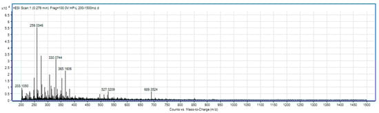 For SLPC hydrolysate, in the range of 85–250 m/z (Figure 3), there are signals indicating hydrolysis up to specific amino acid fragments, respectively, 132 (leucine), 166 (phenylalanine), and 175 (arginine). The mass spectrum of the sample in the range 200–1500 m/z (Figure 4) shows the presence of peptides with molecular weight from 203 (dipeptides) to 689 (oligopeptides).