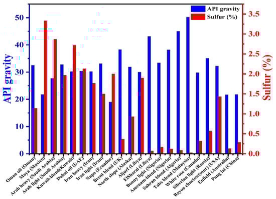 Sulfur is abundant in fossil fuels in both inorganic and organic forms. Inorganic sulfur is distributed as hydrogen sulfide, elemental sulfur, and pyrites, while organic sulfur is present in the form of hydrocarbons such as disulfides, mercaptans, thiol sulfones, thiophenes, and thioether. Some complex forms of sulfur are also dominantly distributed in petroleum products, including crude oil, petroleum liquids, petroleum distillate fractions, etc. Crude oil is a complex mixture of over 200 different hydrocarbon organic compounds. The quality of crude oil is based on the presence of American Petroleum Institute (API) gravity, specific gravity (SG), and sulfur content (S%). Organic sulfur in crude oils ranges from 5 w% to about 0.1 w% [1,2]. It has been reported that more than 200 sulfur-containing petroleum products are enriched with organic forms [3,4]. They are categorized into three main groups: group (I) contains aliphatic and aromatic thiols and their bisulfides as oxidation products; group (II) covers aliphatic and aromatic thioethers; group (III) includes heterocycles based on the thiophenic ring: thiophene, dibenzothiophene (DBT), benzothiophene (BT), and their alkyl derivatives [5,6]. The physical properties and chemical constituents of petroleum products, including sulfur amounts (0.4–5.0 wt.%), are reported differently in the samples collected from various reservoirs [7]. Moreover, a high percentage of sulfur was observed in crude oil collected from a place of higher density [8,9]. Thioethers, thiols, and thiophenes are predominant forms of organosulfur compounds, mainly reported as condensed thiophenes [10]. High sulfur content was reported in the crude oils of the USA (5.5%), Germany (9.6%), and Utah (13.9%) [6]. Gasoline sulfur is rich in non-thiophenic and thiophenic compounds, while diesel oil sulfur is rich in a high amount of benzothiophene and dibenzothiophenes [11]. The major forms such as thiols, sulfides, disulfides, and thiophenes are observed as organic sulfur, while inorganic moieties are present as pyrites [12]. API gravity and organic sulfur content found in the crude oils produced by different countries are shown in Figure 1 [4].