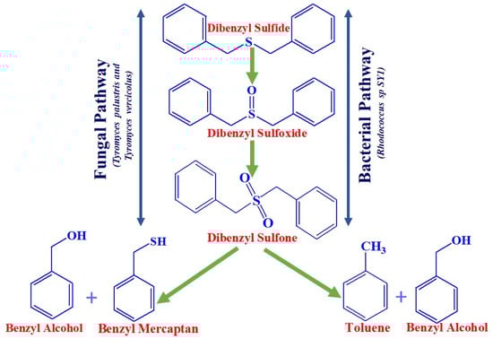 Microbial desulfurization of crude oil came to light in 1935 [57]. Since then, research has been accelerated to determine the significance of microbial biodesulfurization (BDS) processes in the petroleum industry. In the early 1950s, a number of U.S. patents were issued for the application of microbes to carry out the desulfurization of petroleum products to reduce the sulfur contents. Nevertheless, early efforts were ineffective for desulfurization due to its inability to regulate bacteria [16]. Between the 1970s and 1980s, the United States Department of Energy (DOE), in collaboration with other related bodies, attempted to investigate the scope of technology development for desulfurization. Throughout this time, research has been accelerated and scaled up in order to establish desulfurization. Initially, it was reported that bacteria that metabolize hydrocarbons were not of interest [58], but later, bacteria that carried out desulfurization without degrading hydrocarbons were isolated and characterized [59,60]. Many processes have reported that microbes are very specific to their process conditions. Various benefits of BDS over HDS have been described with biological desulfurization, but one of the most interesting was biotransformation at low temperature and pressure. Moreover, it was reported as being rapid, cost effective, easy to handle, and offering a wide range of petroleum products with better safety. This discovery drew the attention of many in the petroleum industry, and they have attempted to adapt to this method for economic purposes. A Texas refinery in the Woodlands reported surprising capital cost savings of 50% and operating cost reductions of 10–20% [61]. The BDS process can also be recorded as eco-friendly. There was a nearly 80% reduction in emissions of greenhouse gases compared to HDS, and this could be because of the operation of BDS at low temperature and pressure. Figure 4 depicts a schematic representation of the biocatalytic desulfurization process by Fungi and Bacteria for Dibenzyl sulfide, a non-thiophenic organosulfur compound in crude oil.