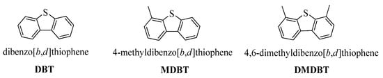 Scheme 1. Structural formulas of refractory dibenzothiophene (DBT), methyl dibenzothiophene (MDBT), and dimethyl dibenzothiophene (DMDBT).