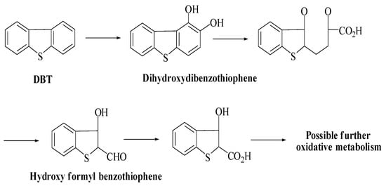 Dibenzothiophene (DBT) is found as a main component of residual post-HDS sulfur and has been applied as a model compound of BDS. Thus, scientists have accelerated their research, focusing mainly on the mechanism of biotransformation of DBT. Alkyl-derivative of DBT is thought to be more refractory to HDS management (Scheme 1). Most of the crude oils are reported to be rich in DBT, which is responsible for the majority of sulfur compounds [73]. As a result, DBT is well thought out as a model refractory sulfur composed of many heterocyclic molecules in the development of new sulfur removal methods or processes [74]. Thus, microbial desulfurization of model compounds can be thought of as the parallel degradation of other such molecules. Therefore, as a preliminary step, it is concentrated to remove the sulfur from DBT, which could be a major part of the thiophenic sulfur found in most fuels.
