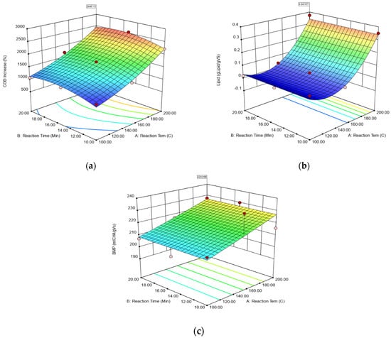 | sCOD Model COD = −833.19227–5.18428 × Reaction temperature + 236.16508 × Reaction time + 0.061396 × Reaction temperature2 − 7.15996 × Reaction time2 | |||||