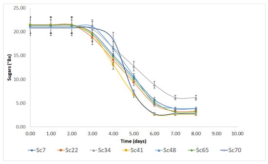 Regardless of origin, strains experienced a shoulder length of approximately 3 days (from 2.44 to 2.78 days) without significant differences; concerning the tail, residual sugar concentration was at 2–3 °Bx, except for strain Sc34, which showed a residual sugar concentration, after 8 days of 6.13 °Bx.