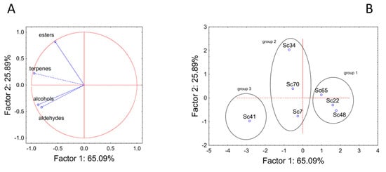 The amounts of esters, alcohols, aldehydes, and terpenes were used as input variables for a Principal Component Analysis to assess the global differences of the strains, as shown in Figure 2. The analysis accounted for ca. 91% of the total variability; alcohols, terpenes, and aldehydes were mainly related to component 1 (factor correlation between −0.80 to −0.94), while esters’ amount was related to component 2 (factor correlation at 0.83) (Figure 2A). The strains were clustered in the factorial space in three different groups (labeled as 1, 2 and 3) (Figure 2B). Group 1 was composed of strains Sc65, Sc22, and Sc48, which were characterized by very similar trends and the low production of VOCs. On the other hand, group 3 comprised only strain Sc41, which was generally characterized by a high production of VOCs, mainly alcohols, aldehydes, and terpenes.