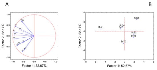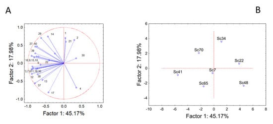 PCA run on alcohols accounted for 75% of the total variability. The input variables generally were related to component 1, except for the compounds 46 (1-pentanol, TL 80 mg/L), 47 (4-methyl-1-pentanol, TL 50 mg/L), 50 (cis-3-hexen-1-ol, TL 0.4 mg/L) and 56 (benzyl alcohol), which showed a correlation with the factor 2 (factor correlations between 0.64 and 0.73) (Figure 4A). The factorial distribution of the strains reproduced the distribution in three classes, as reported for the PCA with the total amounts of the different classes. In fact, strain Sc41 showed a completely different trend from all other strains, as it generally produced a high amount of all alcohols. In the other groups, strains Sc34 and Sc7 showed a similar trend, as well as strains Sc22 and Sc48 (Figure 4B).