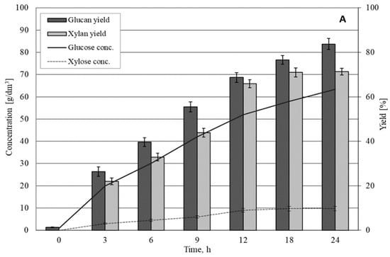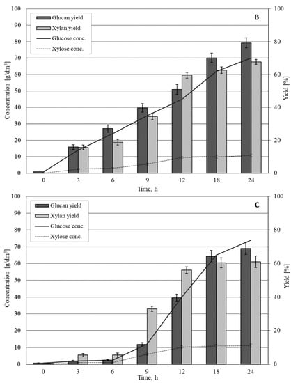 Selected course of enzymatic hydrolysis and obtained glucose and xylose yields ((A)—18.9% dry matter loading/wet substrate loading: 60% w/v; (B)—22% dry matter loading/wet substrate loading: 70% w/v/; (C)—25% dry matter loading/wet substrate loading: 80% w/v; error bars represent standard deviation).
