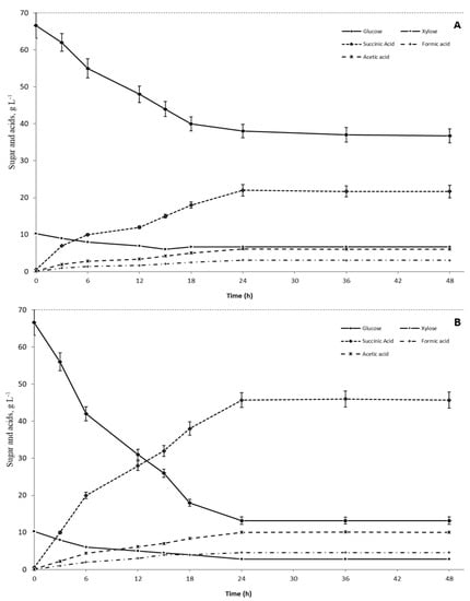 Succinic acid yield (YSA) was calculated as the amount of succinic acid (g) obtained per 1 g of sugars (glucose + xylose) consumed (Equation (3)).