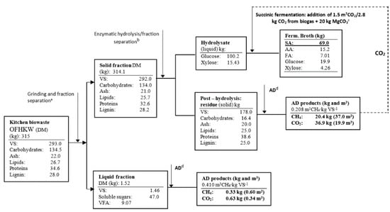 Simplified mass balance of OFHKW complex (1 mg of waste treated), maximizing the products in a biorefinery approach (a—mechanical grinding and fraction separation via centrifugation, b—enzymatic hydrolysis conducted at wet substrate loading: 70% dry matter loading: 22.0, enzymatic cocktail weight expressed as substrate dry matter used during experiment: 5% w/w), c—succinic fermentation with 25% of theoretical MgCO3 dosage, simultaneous addition of biogas and MgCO3: 20–21 g/L, d—anaerobic digestion of post.
