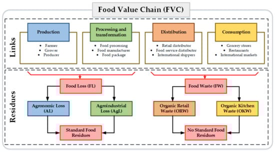 Several definitions and classifications for FW are found in the open literature. However, a clear difference between the residues produced in the agronomic, industrial processing, commercialization, and consumption stages has not been provided [24]. Therefore, an alternative for classifying FW is to consider the FVC links. In general terms, the FVC is composed of four global links: (i) production, (ii) manufacturing and processing, (iii) distribution, and (iv) consumption (see Figure 1).