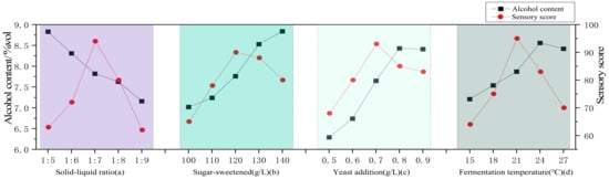 A preliminary investigation of the factors affecting the taste and quality of fermented elderberry wine was conducted using single-factor experiments on 4 factors, including the solid–liquid ratio, sugar sweetening, yeast addition, and fermentation temperature. The factors chosen were the different solid–liquid ratios (1:5, 1:6, 1:7, 1:8, and 1:9), sugar sweetening (100, 110, 120, 130, and 140 g/L), yeast addition (0.5, 0.6, 0.7, 0.8, and 0.9 g/L) and fermentation temperature (15, 18, 21, 24, and 27 °C). Experiments were carried out using the control variable method. Alcohol and sensory scores were used as measurement indices, and Origin8.5 was used for mapping.