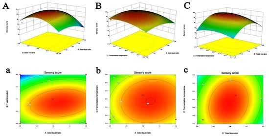 Response surface and contour plots for sensory score. (A,a) Effect of solid–liquid ratio and yeast inoculum. (B,b) Effect of solid–liquid ratio and fermentation temperature. (C,c) Effect of yeast inoculum and fermentation temperature).