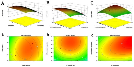 Response surface and contour plots for alcohol content. (A,a) Effect of solid–liquid ratio and yeast inoculum. (B,b) Effect of solid–liquid ratio and fermentation temperature. (C,c) Effect of yeast inoculum and fermentation temperature).