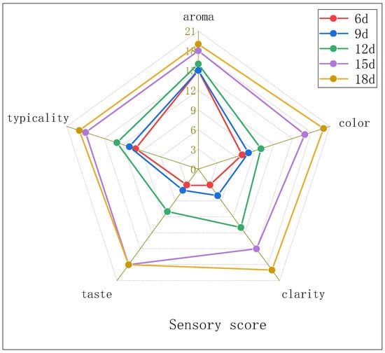 From Figure 4, it can be seen that in the early stages of fermentation, the mixed juice presented a good odor. With the extension of fermentation time, there was a clear change in parameters for every single sensory characteristic, which showed that: the fruit fragrance was prominent and harmonious; the color was ruby red; the clarity was clear and bright with no impurities; the mouthfeel was fresh and delicate, with a sweet and sour flavor and a satisfying aftertaste. It had obvious typicality, with a significantly fruity character and fruity flavor. The final sensory score was 95, closing in on the theoretically predicted value. The samples of elderberry juice were rich in D-terpendiene, and the substance had a flower-like aroma. Subsequently, the juice was fermented and regenerated into damustrone, which contains floral, fruity, and lilac aroma characteristics [].