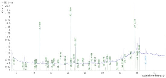 According to the results from GC-MS and NIST software analysis, the total ion flow chromatogram of elderberry wine is shown in Figure 5; 33 volatile chemical compounds were identified, with the contents shown in Table 6.