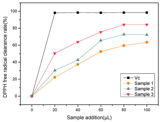 The effects of elderberry wine on antioxidant capacity are shown in Figure 6. Following the addition of the sample, the scavenging ability of DPPH free radicals increased steadily. When sample 1 was 60 μL, the scavenging rate of DPPH radicals reached its maximum of 63.55%. When the sample 2 and sample 3 sizes were 80 μL, the scavenging rates of DPPH free radicals reached the maximum, which was recorded at 72.78% and 84.32%, respectively. The results indicated that elderberry and fruit juice had a similar effect on the scavenging of DPPH radicals. Through fermentation, the scavenging rate of DPPH free radicals in elderberry wine was enhanced, which may be related to the degradation of elderberry in the fermentation process and the release of more antioxidant substances [].
