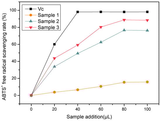 The clearance rates of sample 1, sample 2, and sample 3 increased gradually with the increase in sample dosage, and reached the maximum values at 80 μL; the ABTS radical scavenging activities were 15.8%, 76.32%, and 88.36%, respectively. The results showed that the fruit had a greater ability to scavenge free radicals and reduce oxidative stress [,]. However, after fermentation, the ABTS+ clearance rate of elderberry wine increased, indicating that fermentation made the elderberry release some antioxidant substances and produced beneficial effects [].