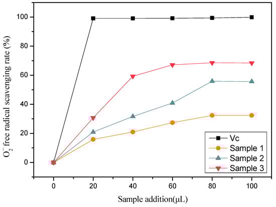 From Figure 8, it can be seen that the free radical scavenging rate of the 3 samples increased as the number of samples added increased. When the dosage was 80 μL, the radical scavenging ability of sample 1 and sample 2 reached their maximum values, which were 42.34% and 65.64%, respectively. When the addition amount was 60 μL, the scavenging ability of sample 3 on radicals reached 88.4%. It can be seen that the radical scavenging ability of fermented elderberry wine was significantly improved compared with unfermented samples [].