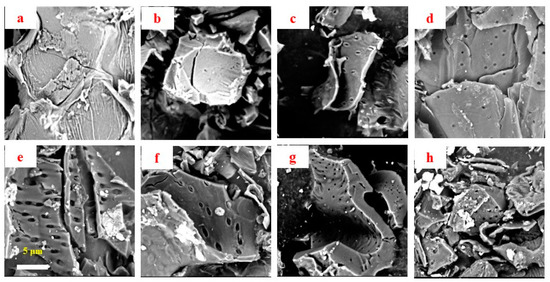 The raw Camellia oleifera fruit shell (COS) presented large curved sheets with many folds on the rough surface (Figure 1a), where some homogeneous small pores existed, providing a precursor structure for the fabrication of high-surface-area carbonized and activated carbon biochars. During the heating process of carbonization, the initial small pores gradually cracked into long and thin holes, and then narrowed to regular-sized small pores with diameter ranging from approximately 0.2 to 0.5 μm in carbonized COS (biochars). Meanwhile, the carbon sheets fell apart, and carbon block appeared. Interestingly, with the temperature raised to 550 and 650 °C (Figure 1e,f), the obvious regular small porous structure displayed in Figure 1d (450 °C) was absent, replaced by long and thin pores again. Over 750 °C, well-developed porosities could be detected in the carbonized biochars (Figure 1g,h).