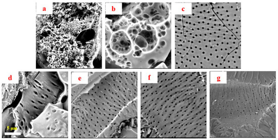 SEM images of activated (a–g) Camellia oleifera fruit shell (COS) samples obtained at 250, 350, 450, 550, 650, 750 and 850 °C.