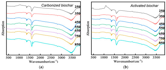 The functional groups of carbonized biomass can be analyzed by FTIR spectroscopy. The differences in absorption peaks in different infrared images were related to the activation of carbonized biomass (Figure 3). Both carbonized and activated biochars showed strong absorption peaks at 3000–3750 cm−1 and 1640–1675 cm−1, representing the stretching vibration of O-H and stretching vibration of C=O. The strong O-H absorption peak was due to the large amount of hydroxyl groups in the structure of three components of biomass (cellulose, hemicellulose and lignin) [25]. The C=O absorption peak of 1640–1675 cm−1 was caused by the glucuronic acid carboxyl groups in hemicellulose and the conjugated carbonyl groups in lignin. There was a second shoulder peak beside the C=O absorption peak, which might be caused by adsorbed O-H. The absorption peak at 2820 cm−1 of carbonized and activated biochars was caused by C-H stretching vibration, indicating the existence of carbonyl groups, which were also mainly attributed to the three main components (cellulose, hemicellulose and lignin) of lignocellulose. In addition, carbonized and activated biochars showed two small absorption peaks at 1340–1465 cm−1. At 1370 cm−1 was the bending vibration of C-H, while at 1424 cm−1 was the symmetric bending vibration of CH2. The bending vibration of the C-H was caused by the stretching of aliphatic C-H in lignocellulose, while the bending vibration of the latter symmetric CH2 was caused by the carboxyl vibration of glucuronic acid and xylan in cellulose. Different from biochars, a-biochars showed a weak absorption peak at 2260 cm−1, which might be due to the stretching vibration of C≡C. It could be speculated that activation only changed the physical structure of the carbonized biomass, generating more pores, but did not change the chemical structure of the carbonized biomass. With the increase in carbonization temperature (250–850 °C), the infrared spectra of biochars and a-biochars had no obvious change, which showed that carbonization temperature had no obvious effect on the chemical structure of biomass.