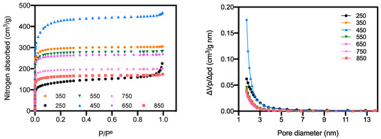 The plots of nitrogen adsorption isotherms and pore size distribution are depicted in Figure 4. The shapes of isotherms suggested that those of biochars prepared at 250 and 450 °C were type II, whereas other isotherms were type I according to the IUPAC classification [26]. Isotherms of biochars prepared at 250 and 450 °C underwent rapid increases in the quantity of adsorption nitrogen at relative pressure <0.1 and >0.9, while a steady process was observed between 0.1 and 0.9. This demonstrated a multilayer adsorption taking place on the external surface of biochars prepared at 250 and 450 °C, with distribution of relatively abundant micropores. Under identical pressure, biochar prepared at 450 °C exhibited much higher adsorption capacity (~4 times) than that of biochar prepared at 250 °C. For other biochars, only a slight increase in the quantity of adsorbed nitrogen was observed at relative pressure of 0.1–0.9, which reflected lower external surface areas of these samples. Figure 4b further validates the micropore structure of prepared biochars, as most of the pores were observed with diameters <2 nm. Only a small amount of mesopores were detected at a relatively narrow pore width range in biochars prepared at 250 and 450 °C.
