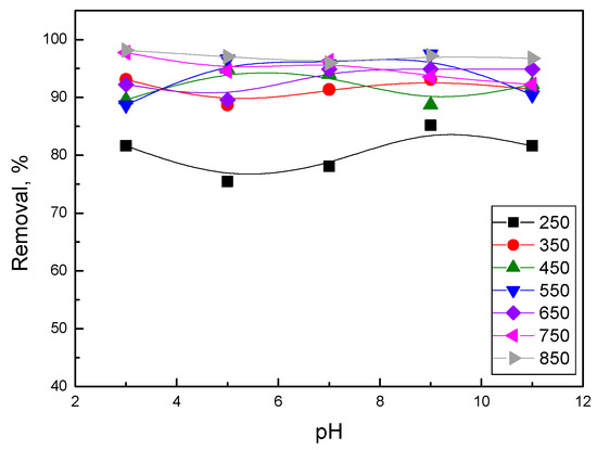 To optimize the pH for mercury adsorption by the activated biochars, an equilibrium adsorption experiment was conducted with an initial concentration of 1 mg/L over a pH range of 3.0–11.0. Figure 6 illustrates the mercury removal rate under different pH conditions. The results showed that a-biochar@850 had the highest removal rate of Hg2+ due to its highly porous structure and O-H/C=O groups. The high-temperature carbonization process contributed to the activated biochar having a stronger Hg2+ removal effect in acidic conditions, which was explained by the accumulated O-H/C=O groups in the biochars. On the other hand, moderate temperature carbonization (i.e., 550 °C) endowed the activated biochar with excellent Hg2+ removal performance in basic conditions. This was ascribed to deprotonated O-H groups in a-biochar@550, which further enhanced the adsorption of Hg2+ on the biochar pore surface. Biochars processed by low-temperature carbonization had the lowest removal effect, possibly due to insufficient lignin removal and low porosity for Hg2+ adsorption.