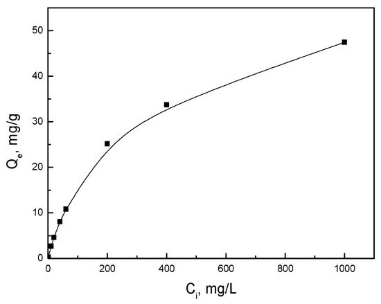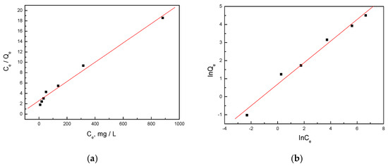 The effect of initial concentration on the removal efficiency for mercury ions is presented in Figure 7. The plot of Ce/Qe versus Ce for mercury is shown in Figure 8a, while the plot of lnQe versus ln Ce is demonstrated in Figure 8b. It could be seen that the Langmuir model and the Freundlich model both fitted the data well, which was distinguished from the traditional ion adsorbent [29] and biochar-derived adsorbent [30,31,32]. From the Langmuir equation, the maximum adsorption capacity of the activated biochars for mercury was calculated to be around 57.6 mg/g. This finding highlighted the high adsorption capacity of the activated biochars for mercury, making them promising adsorbents for environmental remediation.