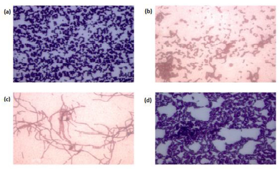 These results reflect that 30% of the isolates were Gram-negative with varying shapes and arrangements (Figure 1b,c), whereas the other 70% were Gram-positive, as seen in Figure 1a,d. Our results are consistent with the findings of Zhai et al. [51] where the proportion of Gram-positive bacteria was greater compared to that of Gram-negative bacteria.