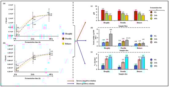 A sharp decline in pH was observed in the Hooghly samples from 7.37 ± 0.12 (0 h) to 3.57 ± 0.12 (48 h). In Purulia samples, a successional decrease was observed from 6.60 ± 0.12 (0 h) to 3.63 ± 0.03 (48 h) with a pH of 4.92 ± 0.11 at mid-phase of fermentation (24 h) (Figure 2c). The pH from each succession of Bokaro samples was found to be 6.50 ± 0.24 (0 h), 4.85 ± 0.09 (24 h) and 3.59 ± 0.01 (48 h), respectively (Figure 2c). A successional change in the acidity content of fermenting samples collected from Hooghly, Purulia and Bokaro was observed. Samples collected from Hooghly showed a gradual increase in titratable acidity from 1.65 ± 0.69 g/100 mL at 0 h to 5.82 ± 0.34 g/100 L at 48 h (Figure 2d). Purulia samples also displayed a similar pattern with the varying acidity content of 1.26 ± 0.03 g/100 mL (0 h) to 2.76 ± 0.04 g/100 mL at the end of the fermentation (48 h) (Figure 2d). The total acidity content in toddy samples from Bokaro was found to be increased successionally from 1.08 ± 0.02 g/100 mL (0 h) to 1.35 ± 0.17 g/100 mL at 48 h of fermentation (Figure 2d).