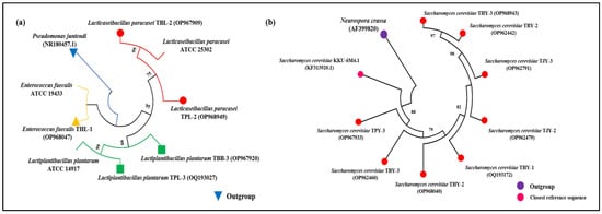 A total of 50 LAB isolates were isolated primarily from the different fermentation stages of the samples collected from Hooghly, Purulia and Bokaro. Based on the growth (A600 ≥ 1.00), 24 isolates were selected finally for further analyses. Two isolates from the fresh sap (0 h) samples of Hooghly were grouped based on the rep-PCR (3 bands: 1500 bp, 2000 bp and 2500 bp); furthermore, a single isolate (n = 1) was chosen as representative of the group, which was identified as Enterococcus faecalis THL-1 (accession number: OP968047) on the basis of 16S rRNA gene sequence (Figure 3a). Three isolates from the mid-phase of fermentation (24 h) in Hooghly samples showed a similar banding pattern (2 bands: 500 bp and 1500 bp), and the representative isolate of the group was identified as Lacticaseibacillus paracasei TBL-2 (OP967909) (Figure 3a). However, Lactiplantibacillus plantarum TPL-3 (OQ193027) was identified in the Hooghly samples from 48 h of fermentation (Figure 3a), where four isolates showed the same banding pattern with a single band at 1500 bp. The successional samples collected from Purulia displayed a reverse pattern of microbial distribution from Hooghly samples. Three isolates from 0 h fermentation of Purulia samples were found to share the same banding pattern that was observed in 24 h samples from Hooghly (2 bands: 500 bp and 1500 bp), and the representative isolate was identified as Lacticaseibacillus paracasei TPL-2 (OP968949). Furthermore, Lactiplantibacillus plantarum TBB-3 (OP967920) was also identified and recovered from the 24 h and 48 h fermented Purulia samples; a total of five isolates from these two groups were found to share the same banding pattern (1 band at 1500 bp) which was also observed in the 48 h fermented Hooghly samples. The similarity was found between the 0 h samples of Purulia and Bokaro as the 0 h of fermentation in Bokaro samples was found to be dominated by Lacticaseibacillus paracasei TPL-2 (OP968949). Interestingly, three isolates from 24 h fermented Bokaro samples were found to be the same group of isolates from 0 h of Hooghly samples which showed three bands in rep-PCR (1500 bp, 2000 bp and 2500 bp), where the representative isolate was also identified as Enterococcus faecalis THL-1 (OP968047). The final stage of fermentation in Bokaro samples also revealed the presence of Lactiplantibacillus plantarum TBB-3 (OP967920), which was also found common in the 48 h group of Purulia sample (Table 1).