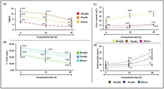 Phase-wise changes in (a) °BRIX content, (b) total sugar profile, (c) total ester content and (d) crude protein content, over the course of the natural fermentation of toddy.
