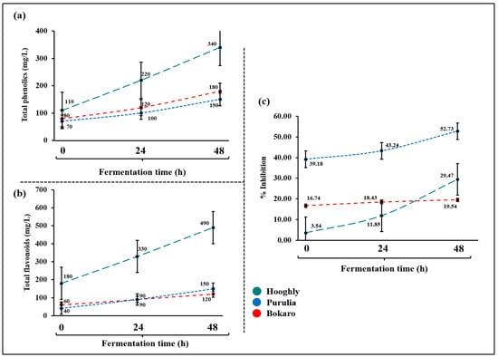 Total alcohol contents in samples of Hooghly, Purulia and Bokaro during fermentation (0 h to 48 h) increased from 2.08% ± 0.07 to 6.57% ± 0.12, 1.20% ± 0.02 to 6.55% ± 0.01 and 2.01% ± 0.02 to 6.60% ± 0.01, respectively (Figure 2e). The total alcohol content is composed of a very less proportion of methanol compared to ethanol in all the successional samples. Methanol concentration in Hooghly, Purulia and Bokaro samples was 0.38% ± 0.01, 0.5% ± 0.35 and 0.4% ± 0.01, respectively, whereas the final concentration of ethanol after the 48 h of fermentation was 6.19% ± 0.1, 6.5% ± 0.01 and 6.2% ± 0.2, respectively (Table 2). Alcohol in the fresh sap is attributed to the continuous fermentation that goes on during the daytime under sunlight, while the pots are still attached to the palm tree. A gradual decrease in °BRIX profile (Figure 4a) and total sugar content (Figure 4b) was observed throughout the natural fermentation of toddy from various sites. Total ester content (Figure 4c) and protein content (Figure 4d) in the fermenting samples were found to be increased during the natural fermentation. Interestingly, the sharp increase in contents of total phenolics, flavonoids and DPPH value was observed during the natural fermentation of fresh saps to toddy (Figure 5a–c).