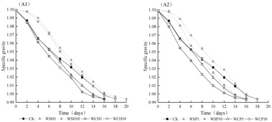 The fermentation curves for different experimental treatments are shown in Figure 1, and it can be found that all wine samples completed the fermentation in 16 to 20 days. Different mixed fermentation methods have great impacts on the fermentation rate of wine, as shown in Figure 1(A1); WCH1 and WCH10 completed the fermentation two to four days earlier than the other groups. Among them, the fastest fermentation was WCH10, which dropped to 0.994 at 16 days. In contrast, the slowest fermentation was the 1:1 sequential inoculation (WSH1), which completed the alcoholic fermentation in twenty days, four days slower than WCH10. Compared with the control, the species H. uvarum inoculated with S. cerevisiae can promote the process of alcohol fermentation. Secondly, the faster the fermentation, the more was added. These phenomena indicate the interaction between H. uvarum and S. cerevisiae favors alcoholic fermentation. As shown in Figure 1(A2), the pattern of fermented P. fermentans was more consistent with that of H. uvarum. The wine sample of 10:1 simultaneous inoculation (WCP10) finished the alcohol fermentation first, and the wine sample of 1:1 sequential inoculation (WSP1) finished slowest.