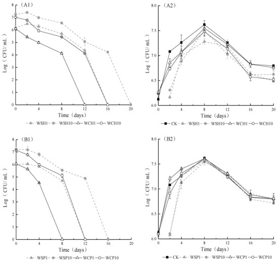 During wine alcohol fermentation, wine samples were sampled and coated on WLN plates every four days. The dynamics of various yeast types during fermentation were monitored by the number of yeast colonies in WLN. The resulting yeast growth dynamics change curves are shown in Figure 2. As shown in (A1), H. uvarum survived in wine from 12 to 20 days due to different inoculation methods. The lower proportion of 1:1 simultaneously inoculated fermentation methods survived for the shortest time and could not be found on the WLN medium at 12 d. However, in the high proportion of the 10:1 sequential inoculation method, it can survive in the fermentation broth for a long time before gradually disappearing at 16 to 20 days. Overall, in the sequential inoculation system, the number of H. uvarum increased in the first two days and decreased after inoculation with S. cerevisiae, and the maximum number was up to 3.1 × 106 CFU/mL (WSH1) and 2.53 × 107 CFU/mL (WSH10). During simultaneous inoculation, the number of H. uvarum declined and disappeared earlier in the fermentation system earlier. As shown in Figure 2(B1), the effect of different inoculation methods on P. fermentans was similar to that of fermented yeast in H. uvarum, but the difference was that the survival time of P. fermentans was less than that of H. uvarum, with only 8–16 days.