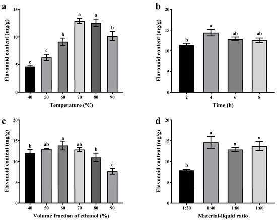 The effects of various factors on extraction of total SHFs from mycelia: (a) temperature (°C); (b) time (h); (c) ethanol volume fraction (%); and (d) material–liquid ratio (w/v). Differing letters above bars indicate significant (p < 0.05) differences according to Tukey’s multiple comparisons test.