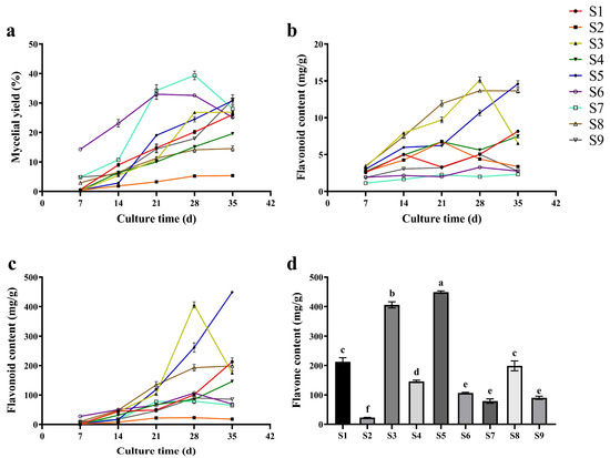 Mycelia from nine sanghuang strains as described in Section 2.1 were harvested following SSF (5–35 day culture period). Mycelial yield, flavonoid content per g of mycelium, and total SHF content per 100 g of SSF medium were measured and compared (Figure 2). Mycelial yield was highest for strains S6 and S7 (Figure 2a), flavonoid content per g of mycelium was highest for S3 and S8 (Figure 2b), and total SHF content was highest for S3 and S5 (Figure 2c). For each strain, a maximal value of total SHF content was used for comparative analysis, which indicated that content was highest for S3 and S5, and these values were significantly different from those for the other seven strains (Figure 2d).